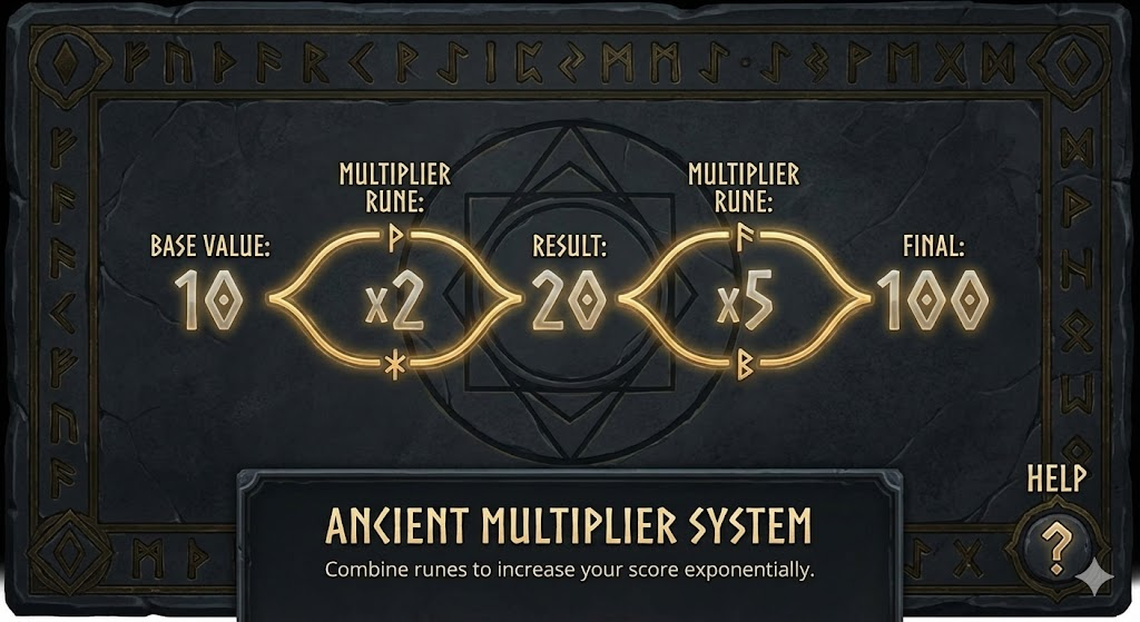 Palet warna didominasi emas, merah tua, dan hijau batu, menciptakan kesan agung dan sakral. Efek visual tidak dibuat berlebihan, sehingga fokus pengguna tetap pada simbol dan dinamika permainan, bukan sekadar efek cahaya.